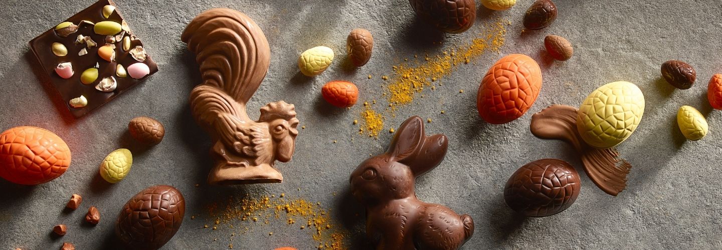 Colorful chocolate eggs, along with bunny and chick figures, symbols of Easter, are offered in a variety of flavors including dark, milk and ruby chocolate, appealing to guests of all ages. This handcrafted collection blends traditional motifs with a modern touch.
