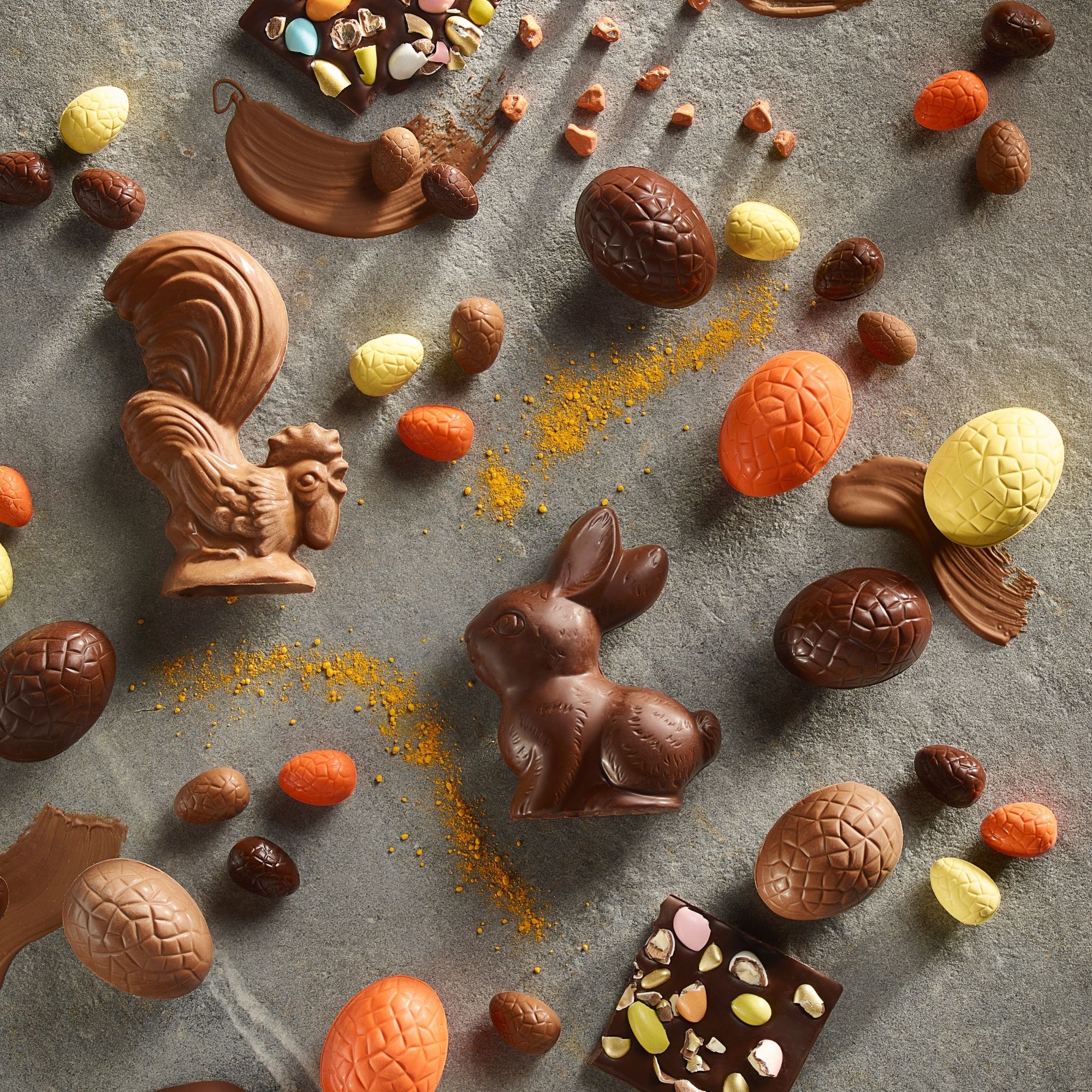 Colorful chocolate eggs, along with bunny and chick figures, symbols of Easter, are offered in a variety of flavors including dark, milk and ruby chocolate, appealing to guests of all ages. This handcrafted collection blends traditional motifs with a modern touch.
